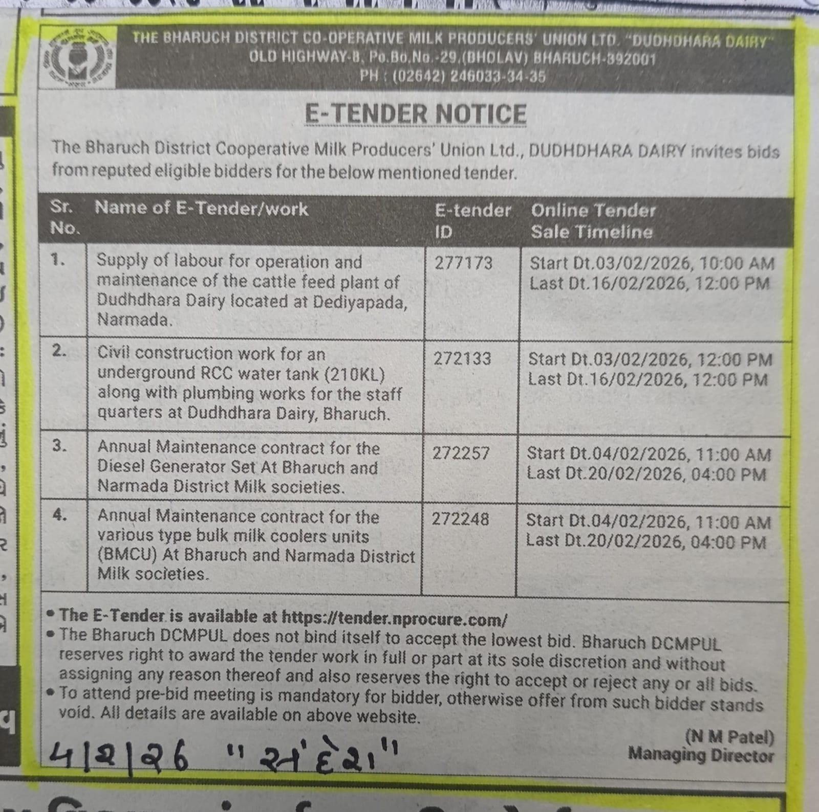 Purchase Of Cattle Feed Raw Materials For The Cattle Feed Plant Located At Dediyapada, Near Janki Ashram Sagbara Road Of The Bharuch District Co-operative Milk Producers' Union Ltd. "Dudhdhara Dairy” Details Of eligibility criteria for this tender and procedure to purchase the tender is available on website www.nprocure.com |