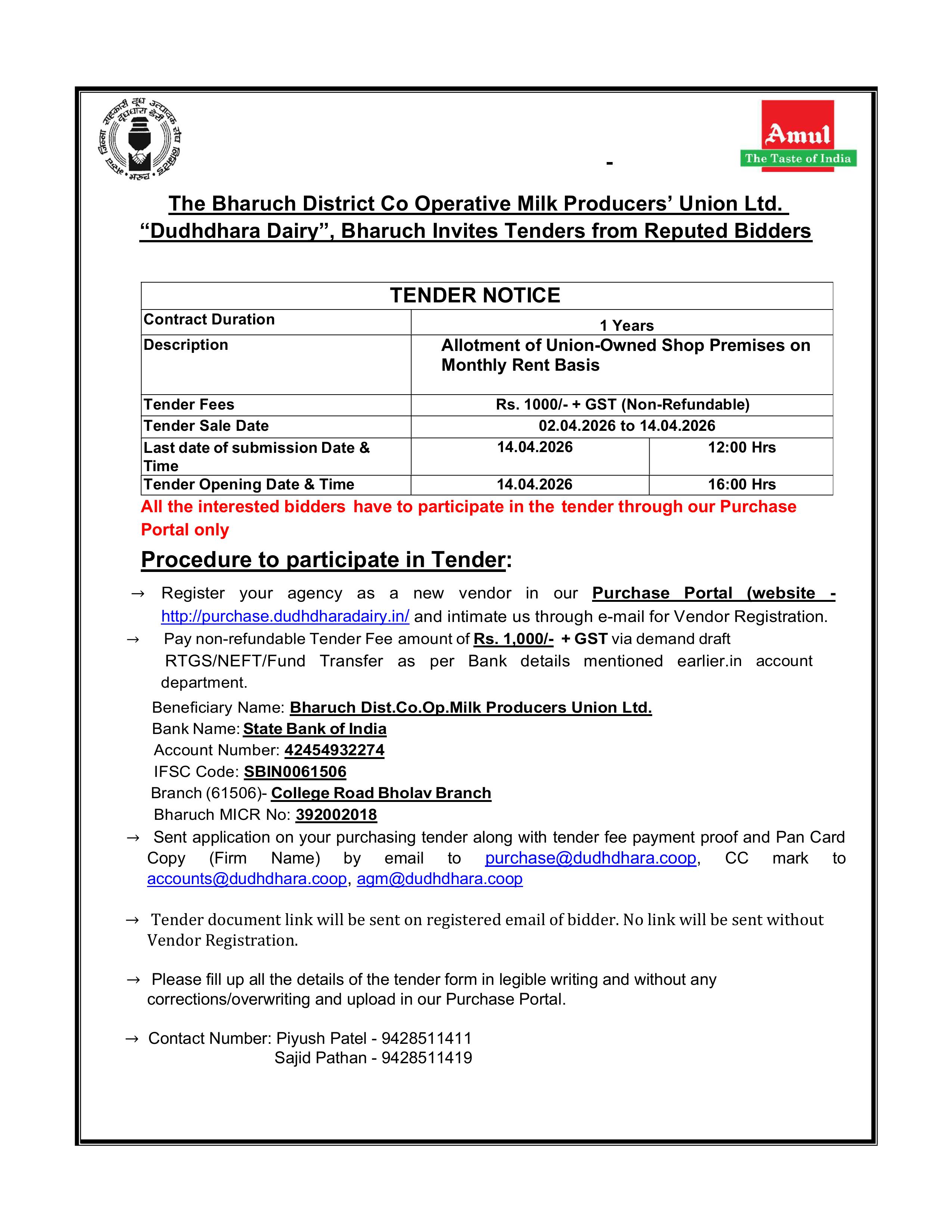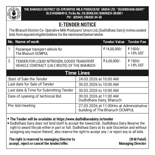 Dudhdhara Dairy is going to purchase new uniform for their Employees. So, all suitable vendors are advice to send samples of “Uniform cloth”at Dudhdhara dairy, Old N.H.-8, College road, Bholav, Bharuch-392 002.